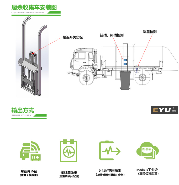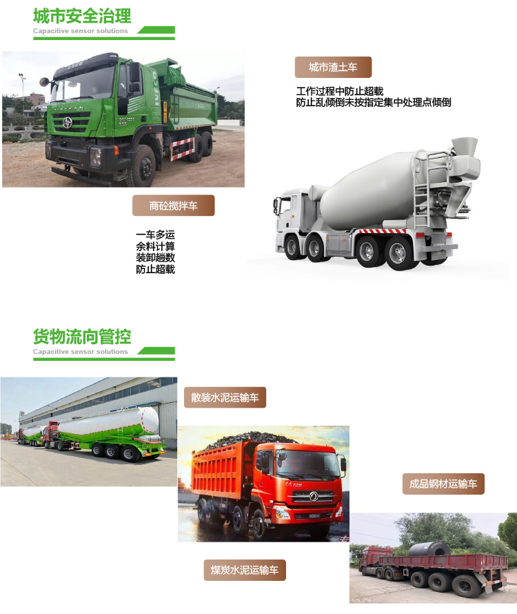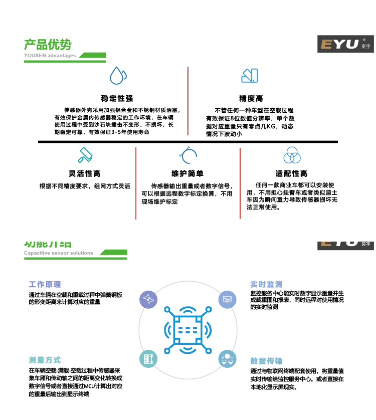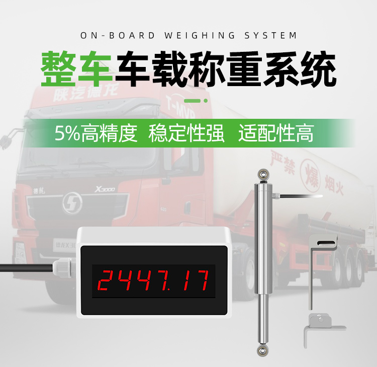 整车车载称重系统是⼀款通过在商用车加装空载、重载形变变化测量传感器,通过⻋辆在空载和重载过程中弹簧钢板的形变距离来计算对应的重量,在⻋辆空载-满载-空载过程中传感器采集⻋厢和传动轴之间的距离变化转换成数字信号或者直接通过 MCU计算出对应的重量后输出到显示终端