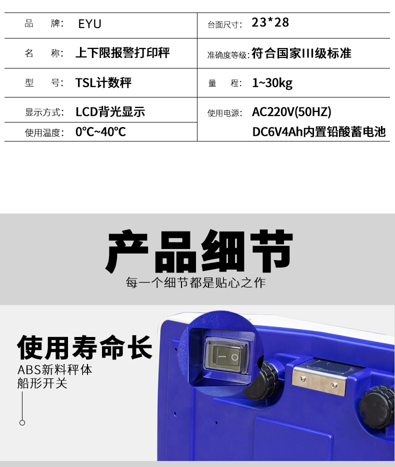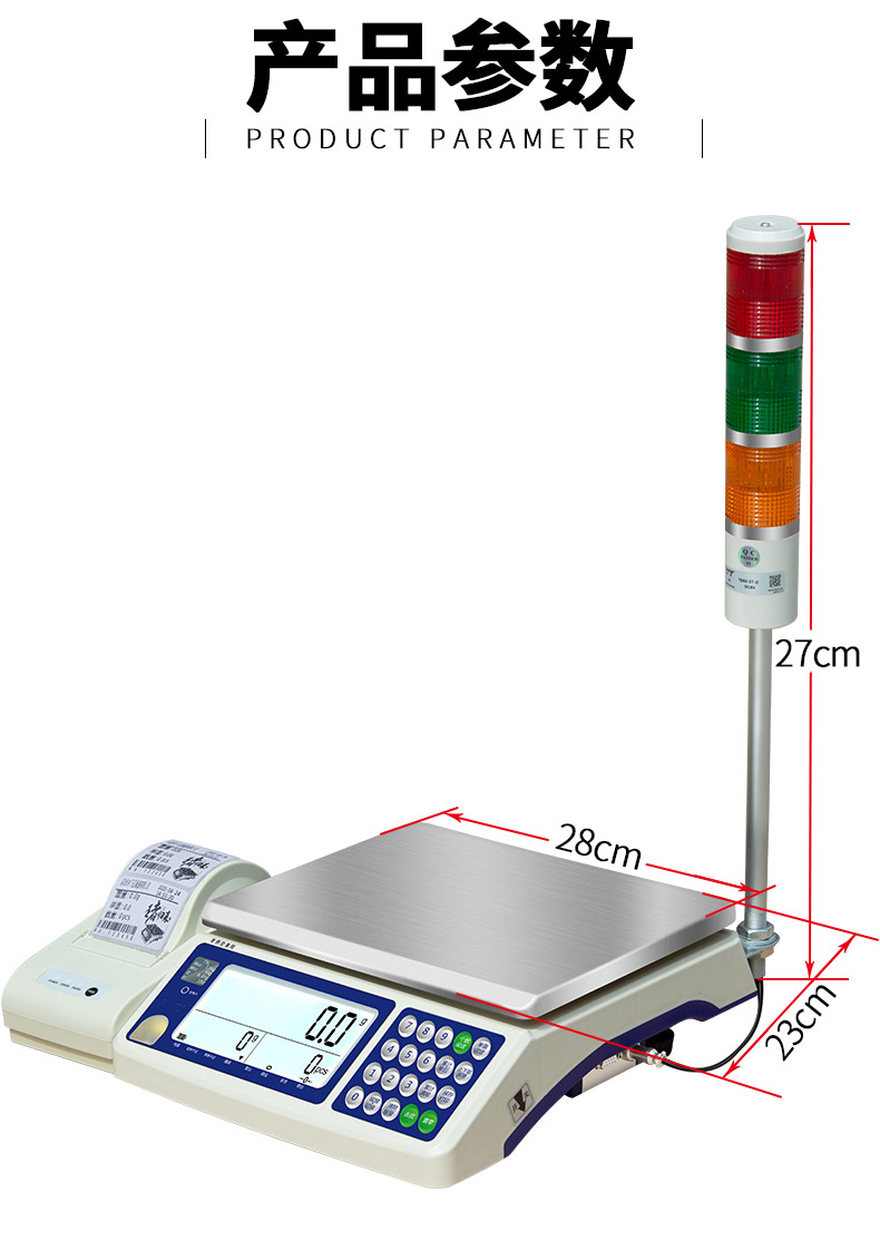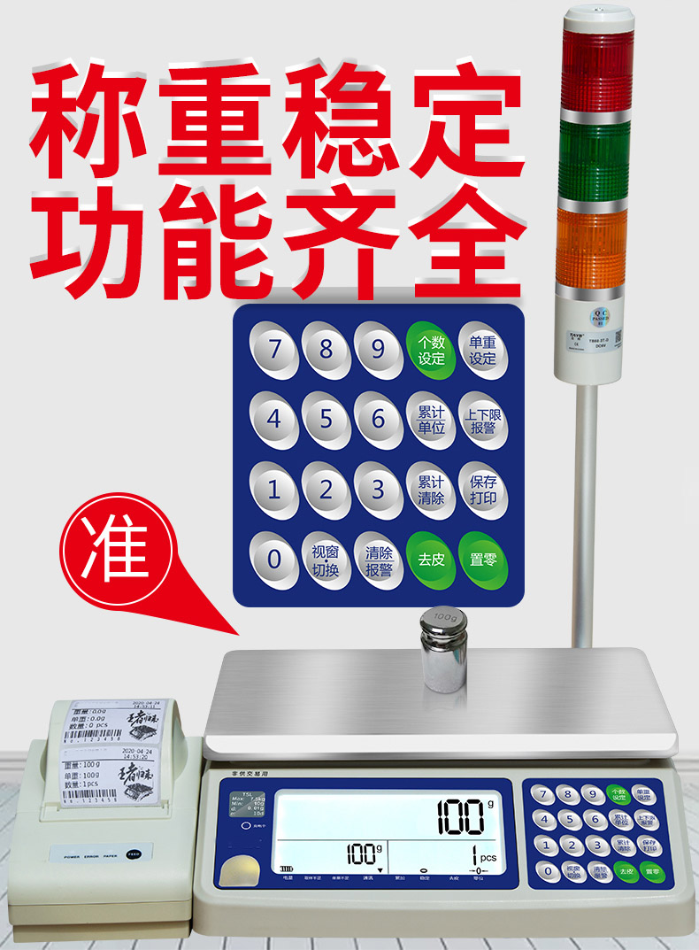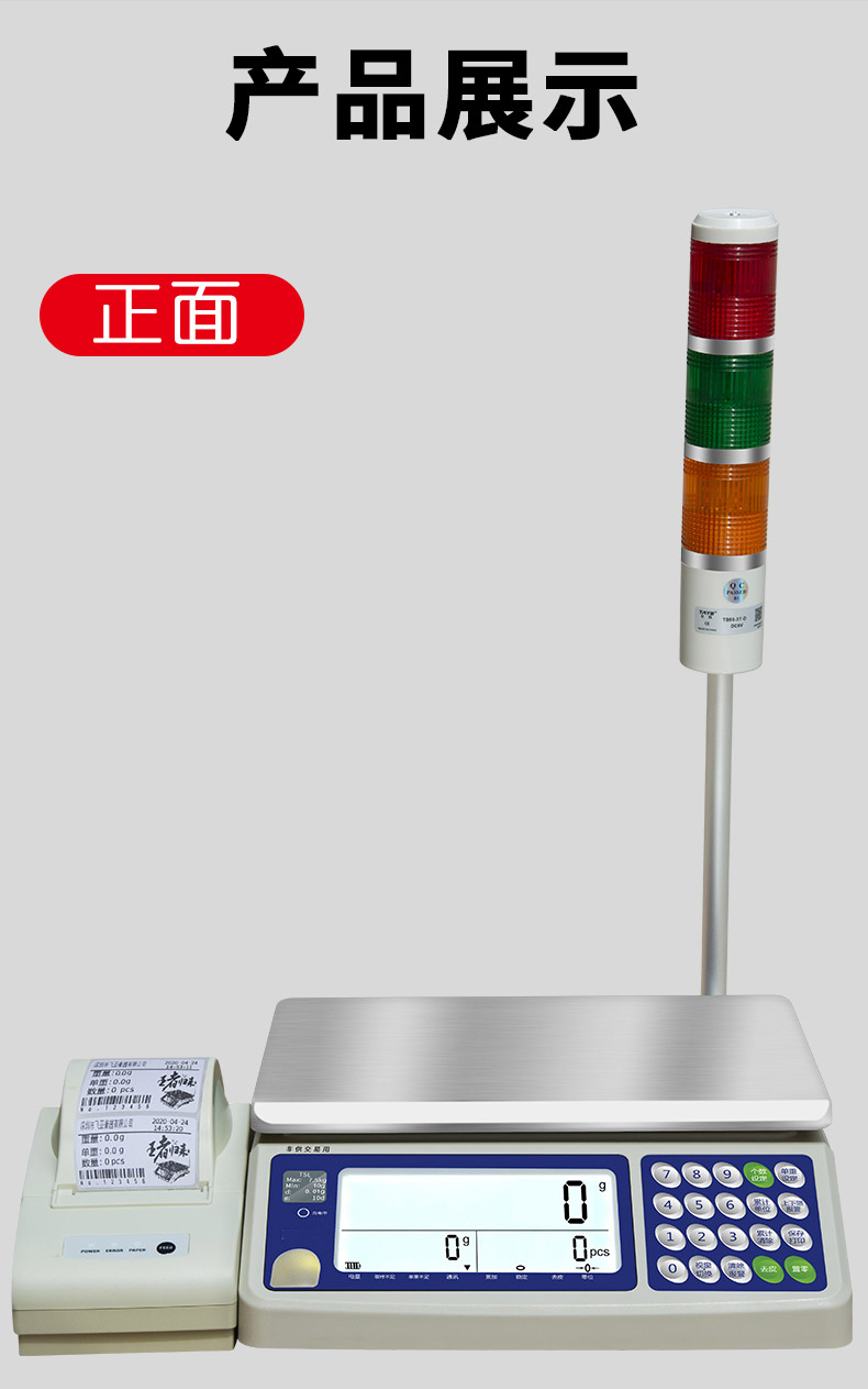 简介:带打印报警灯桌秤 型号:TSC-A 品牌名称:奕宇 称量/分度值:1.5~30kg/0.1~1.0g 精准度等级:符合国家Ⅲ级标准 使用温度:0℃~40℃ 主要功能:标签打印 小票 不干胶 带报警灯 计数 上下报警灯 。