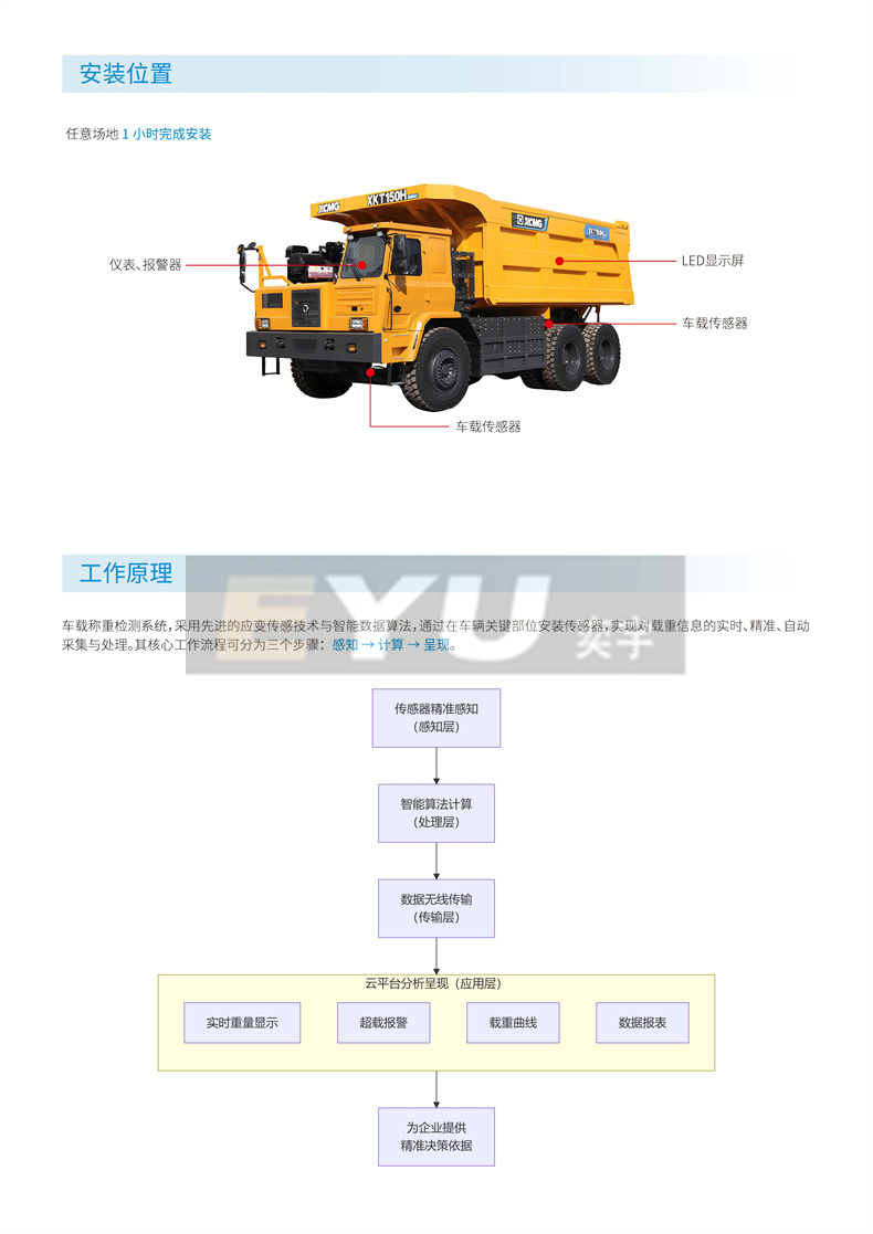 工作过程:1、无线传输:计算出的实时重量数据,通过车载终端的无线通信模块,自动上传至云端管理平台。 2、多维展示:
