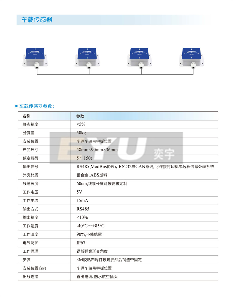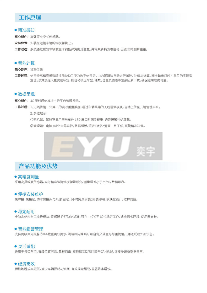 工作过程:系统通过感知车辆载重时钢板弹簧的形变量,并将其转换为电信号,从而实时测算重量。